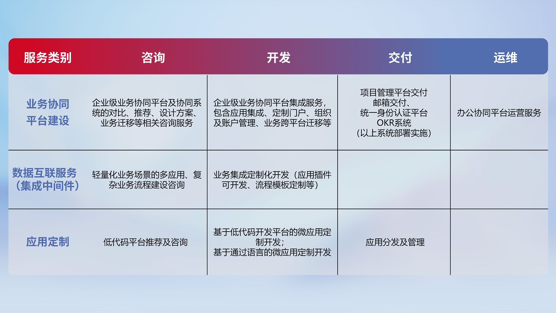 针对钉钉、、企微、、IDaas等平台级产品提供产品的规划、、方案、、交付、、、、定制化开发等服务,,,实现如统一协同办公、、、、智能客户服务、、、混合会议管理、、智能数据查询、、、、等业务场景,,实现数字化转型。。。。